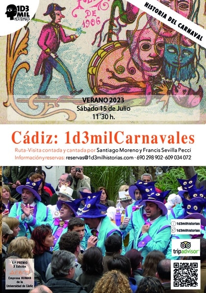 ¿Cuando surge el Carnaval en Cádiz? ¿Desde cuando existe el Concurso de coplas de Carnaval? ¿Cómo surgieron las distintas modalidades de agrupaciones y cuales siguen vigentes? ¿Y sus lugares de celebración? Todas estas respuestas y mucho más en un nuevo paseo contado y cantado por el casco histórico de Cádiz. Con más de 20 coplas de Carnaval desde 1884 hasta la actualidad. Y como fin de fiesta, un aperitivo en una taberna de Cádiz, ¿te lo vas a perder?